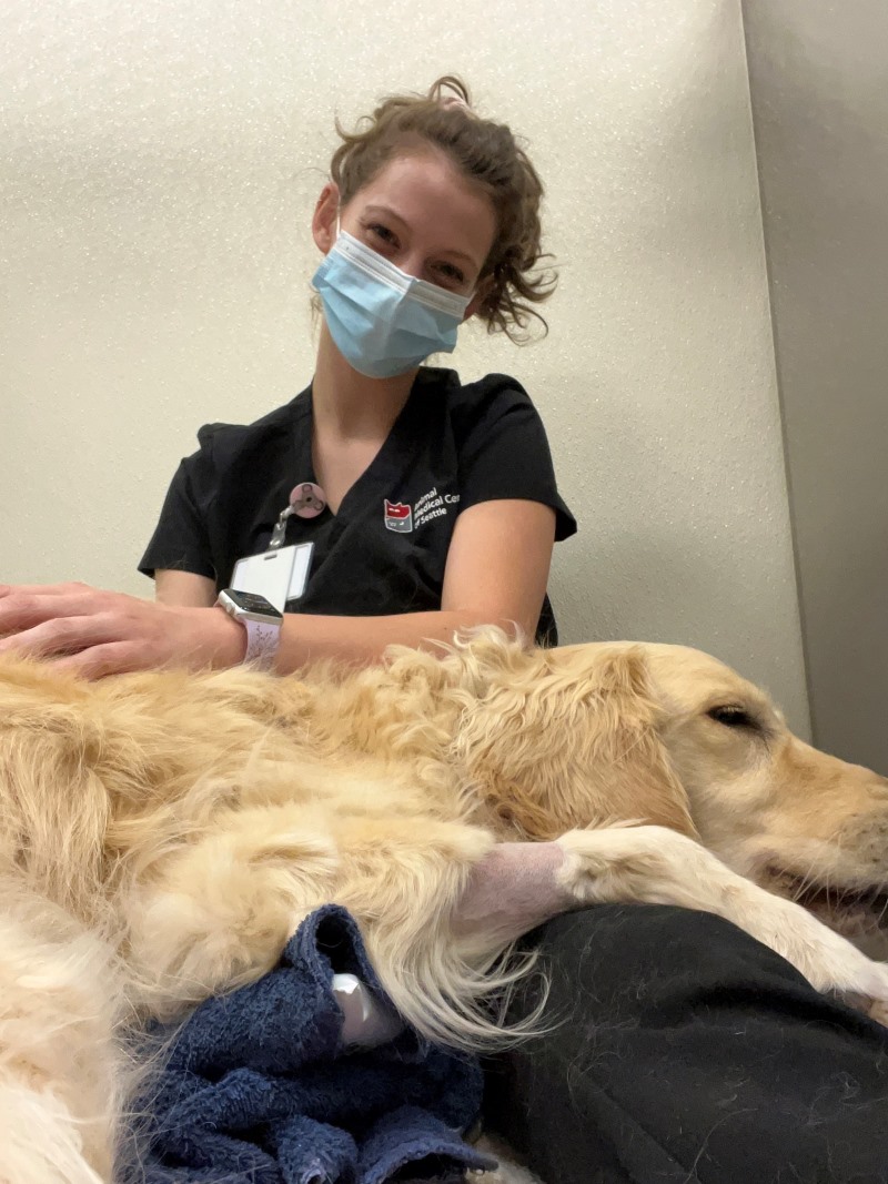 In August of 2021, Shasta Mae underwent surgery to repair a torn cranial cruciate ligament, so surgery wasn’t new to her. But in August 2022, almost exactly a year later, she was diagnosed by her regular veterinarian with a diaphragmatic hernia and was referred to the Animal Medical Center of Seattle for emergency surgery. A diaphragmatic hernia is a life-threatening condition in which a tear in the diaphragm allows organs in the abdomen to migrate into the chest cavity. Shasta Mae’s diaphragmatic hernia was close to her left lumbar region, and her spleen, omentum, and half of her stomach were within the chest cavity. Her spleen was necrotic and had to be removed (splenectomy). Her omentum, which is a vascularized, fatty tissue that covers and supports the intestines in the lower abdomen, had adhered to some of the organs in her chest cavity and had to be carefully ligated free.